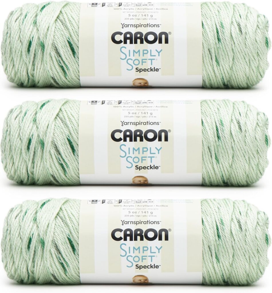 Caron Simply Soft Speckle White Sage Yarn (100% acrylic, 5 oz/141g, 235 yards) is a worsted-weight yarn with a subtle speckled effect, adding visual interest to baby blankets. Its silky sheen and softness make it a favorite for crochet blankets and garments. Machine-washable and dryable, it’s practical for everyday use. The yarn’s smooth texture ensures easy stitching, and its safe colors are free from harmful dyes, though it lacks formal OEKO-TEX certification.